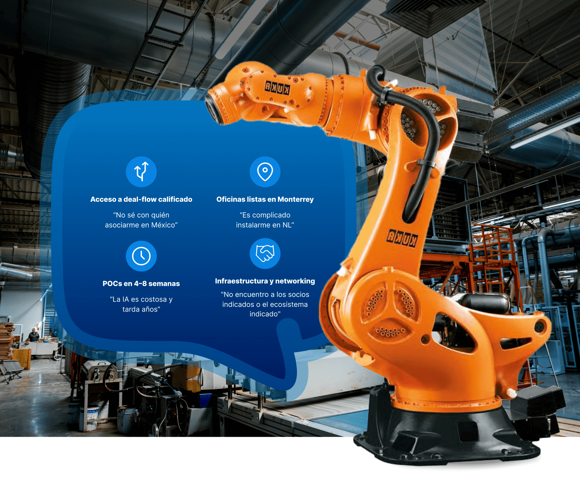 Contamos con más de 35 empresas de tecnologías en diferentes sectores, implementa inteligencia artificial en tus empresas, rápido y potencializa tu trabajo, en 4 a 8 semanas. y expande tu negocio con oficinas listas en Nuevo León-Texas.